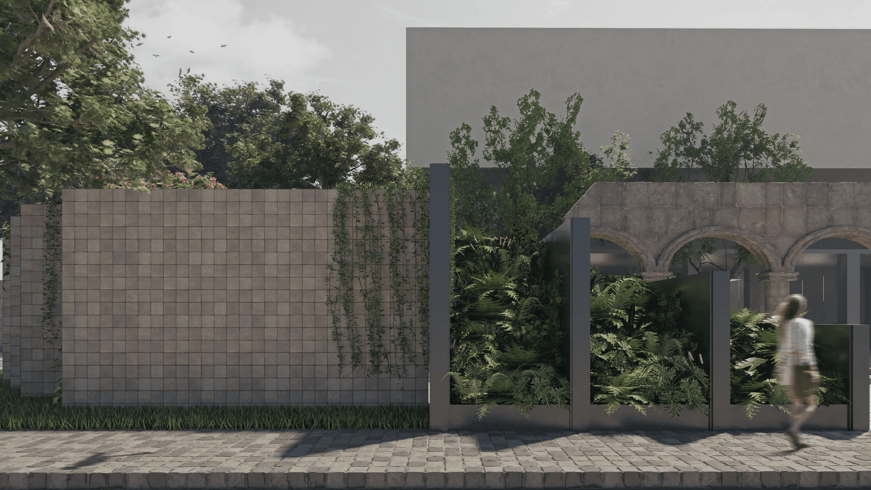 El proyecto busca una morfología entre la arquitectura del lugar y una arquitectura que sitúe al hombre contemporáneo en su mundo; la piedra y el acero establecen un diálogo del tiempo creando un nuevo recinto, albergando y enfatizando la escultura existente de un acueducto antiguo en el corazón del patio.