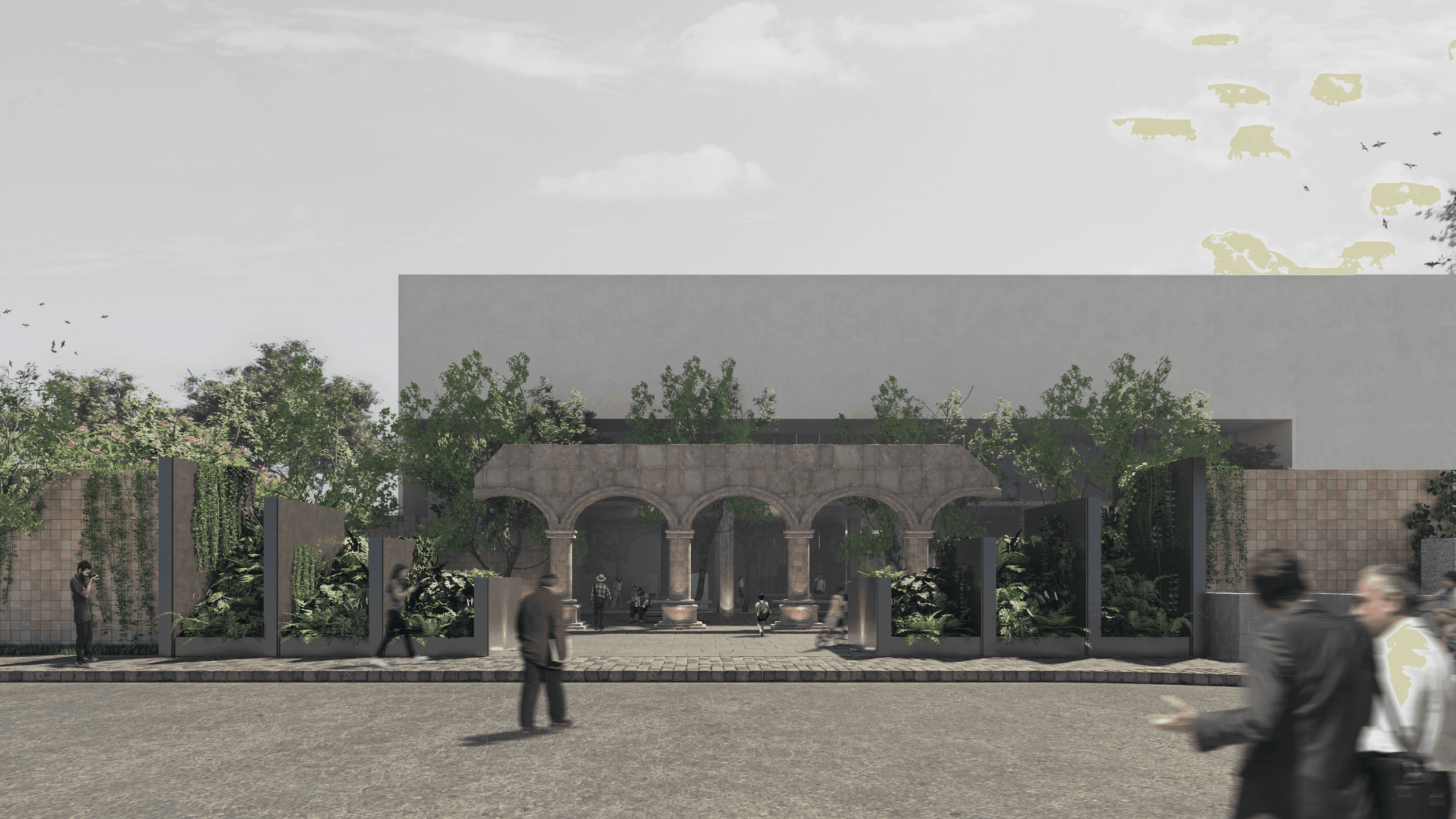 Bajo la necesidad de generar un nuevo motivo de ingreso para la Cámara de Comercio de Guadalajara, se realizó una intervención donde el elemento principal es la preexistencia de un muro de cantera amarilla.
